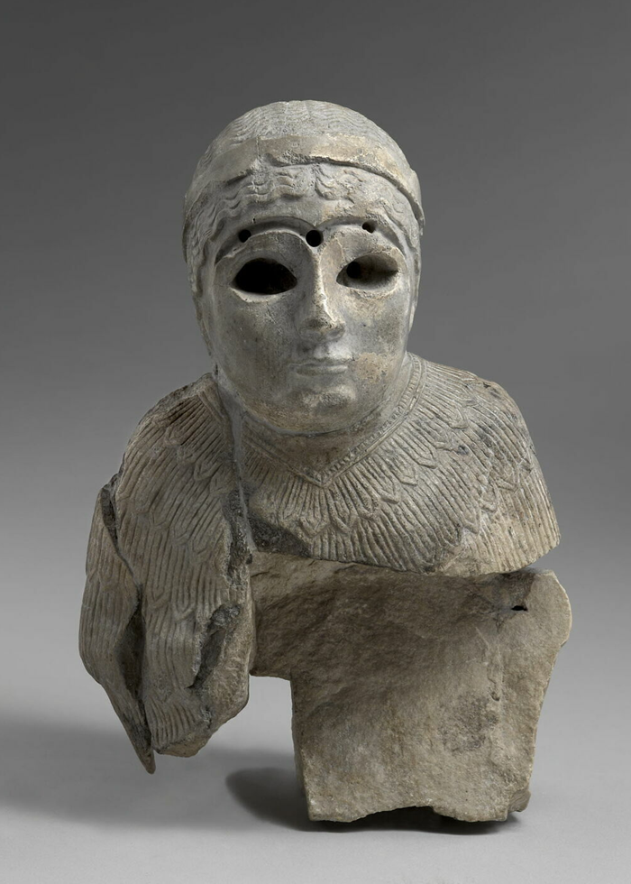 Bust of a seated orant [female worshiper], dressed in a kaunakès cloak, hair styled in a bun and held by a headband, the eyes and eyebrows were formerly inlaid.