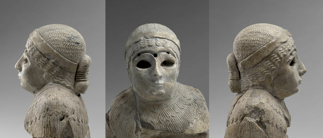 royal kaunakes, the headband, the hairstyle, the knotted bun, the inlaid eyes, and