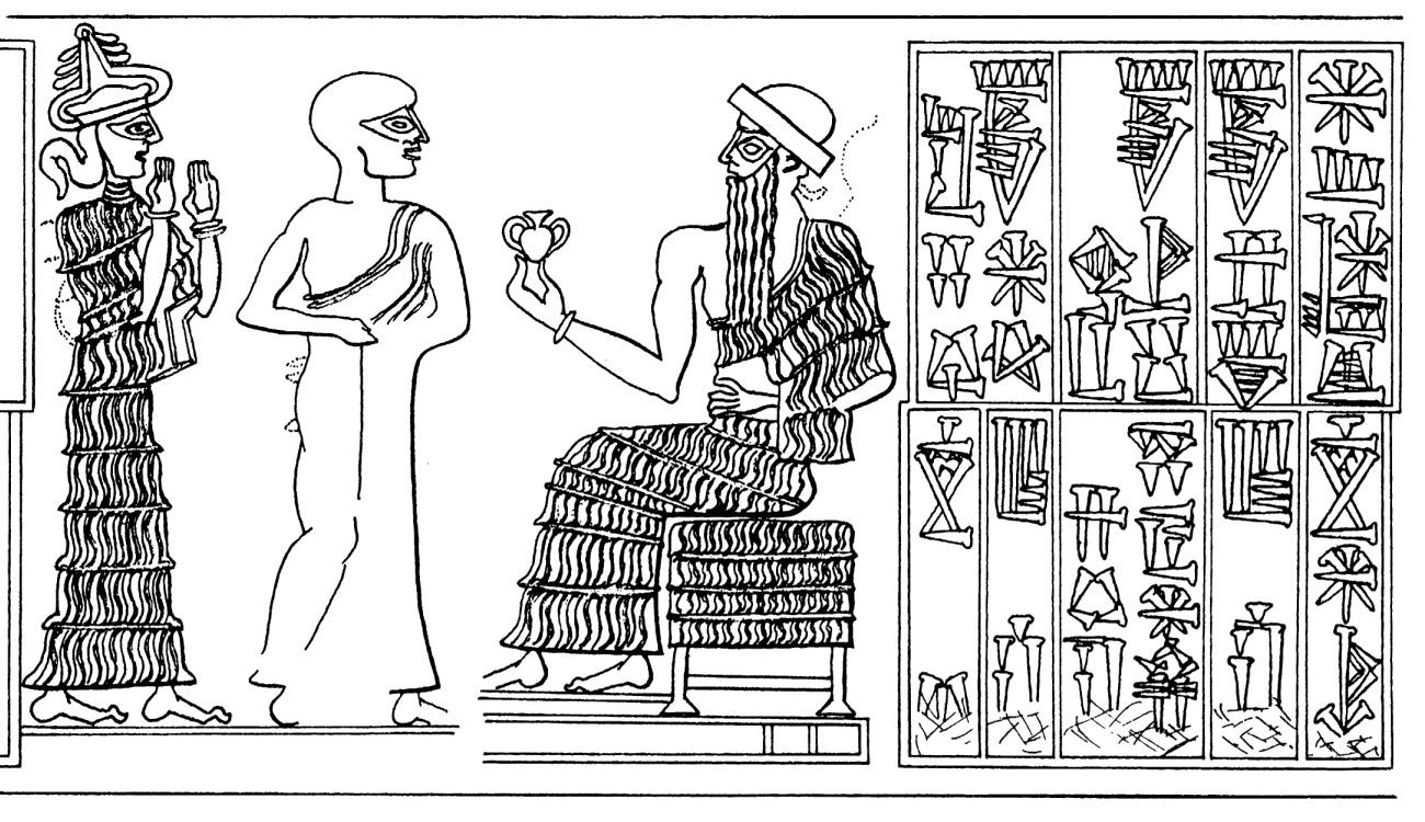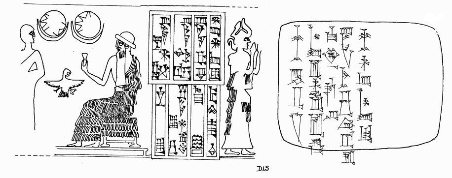 Seal of the scribe Ur-ku-nun-na. He likewise does not hold up his hands in reverence. This means he was part of the high nobility or perhaps the royal family itself, even though his father was a mere karushda, an animal fattener who runs a stockyard. This means the father was a rich merchant. or perhaps a member of the minor nobility who was in charge of a state-owned stockyard that supplied the court officials. See "The Scribe"